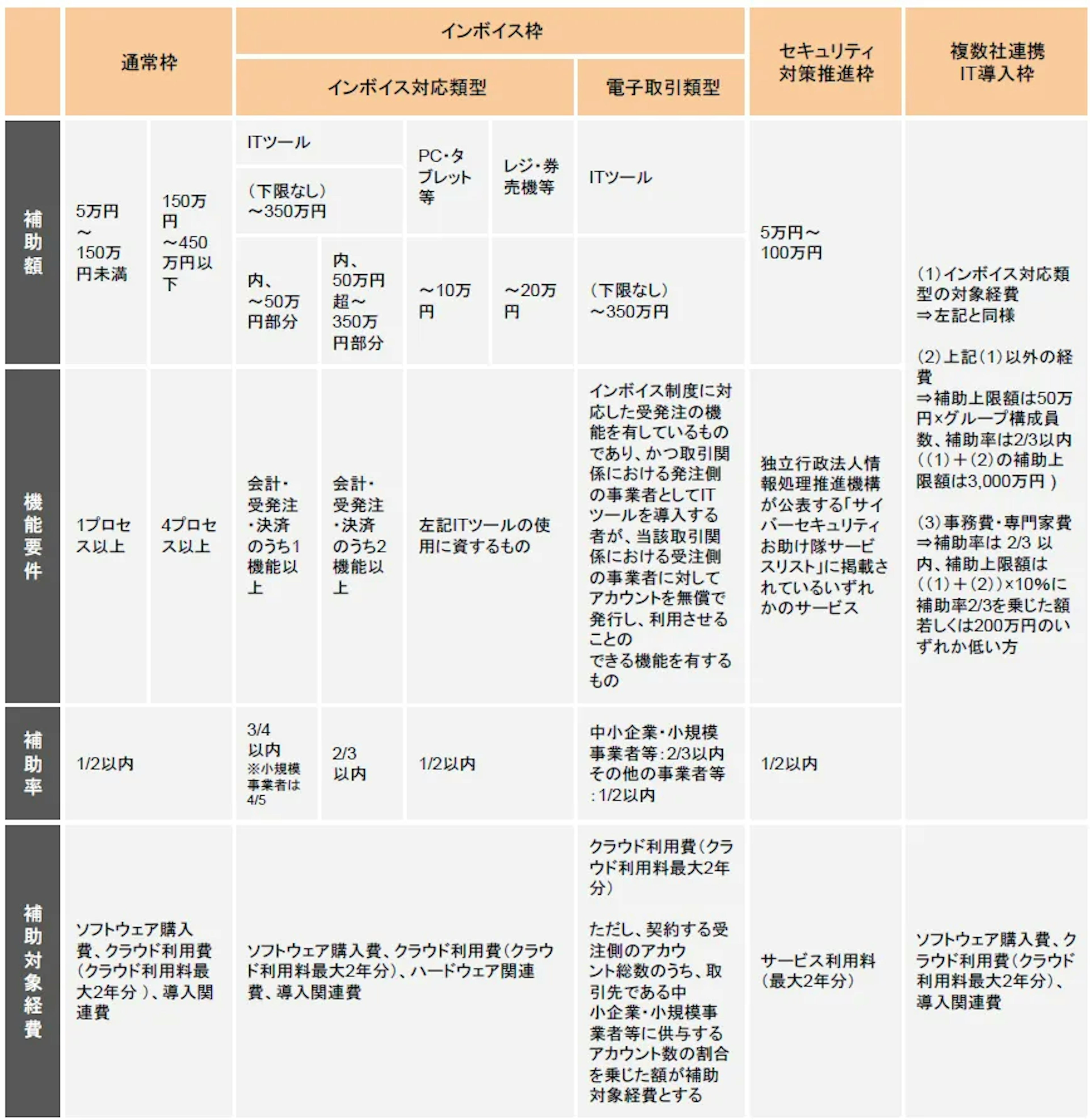IT導入補助金は事業目的に応じて5つの申請枠が用意されています。各枠ごとに補助額や補助率、補助対象経費などが異なります。