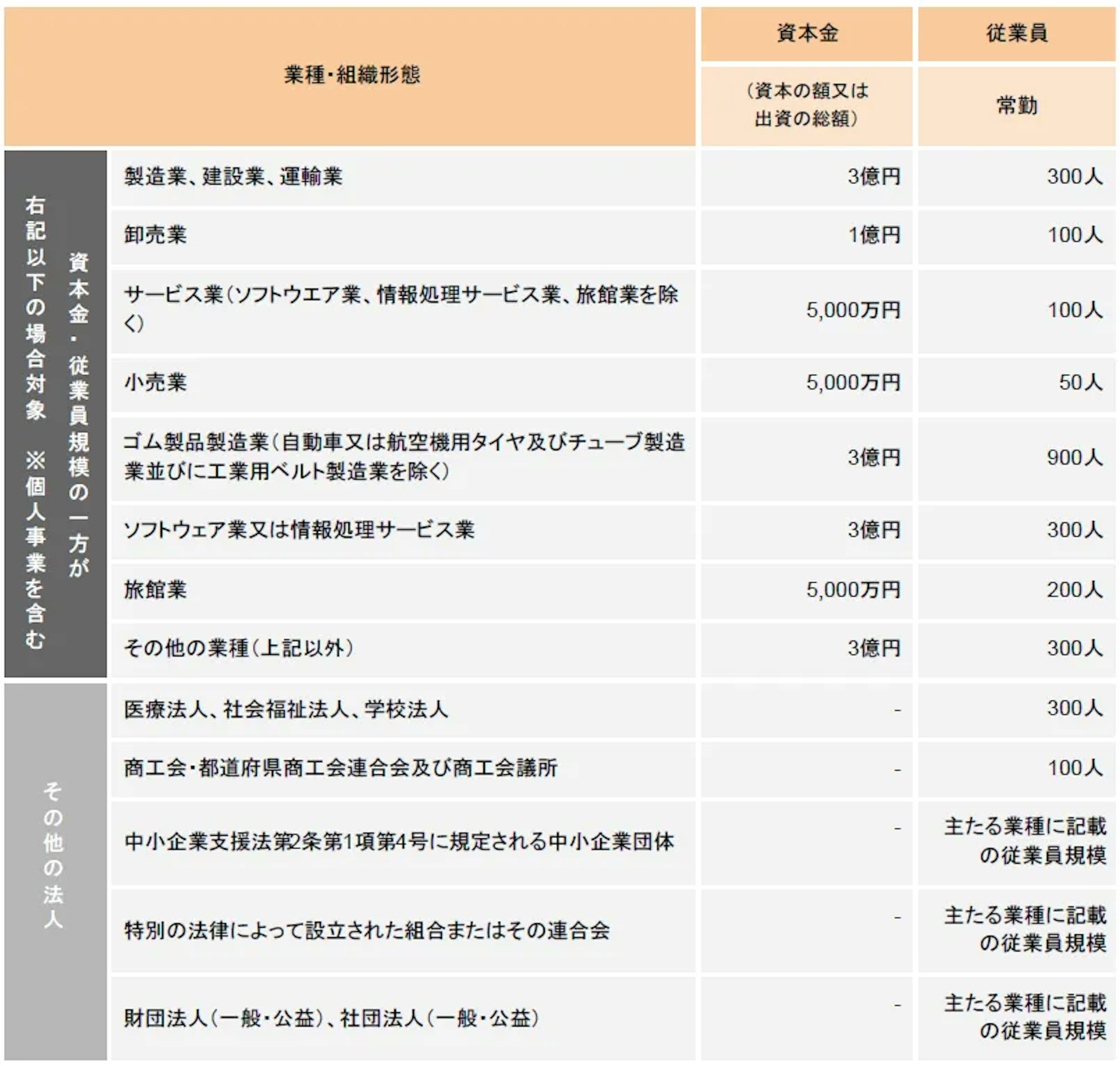 各申請枠において対象とされている「中小企業・小規模事業者等」※2 は、以下のように定義されています。
