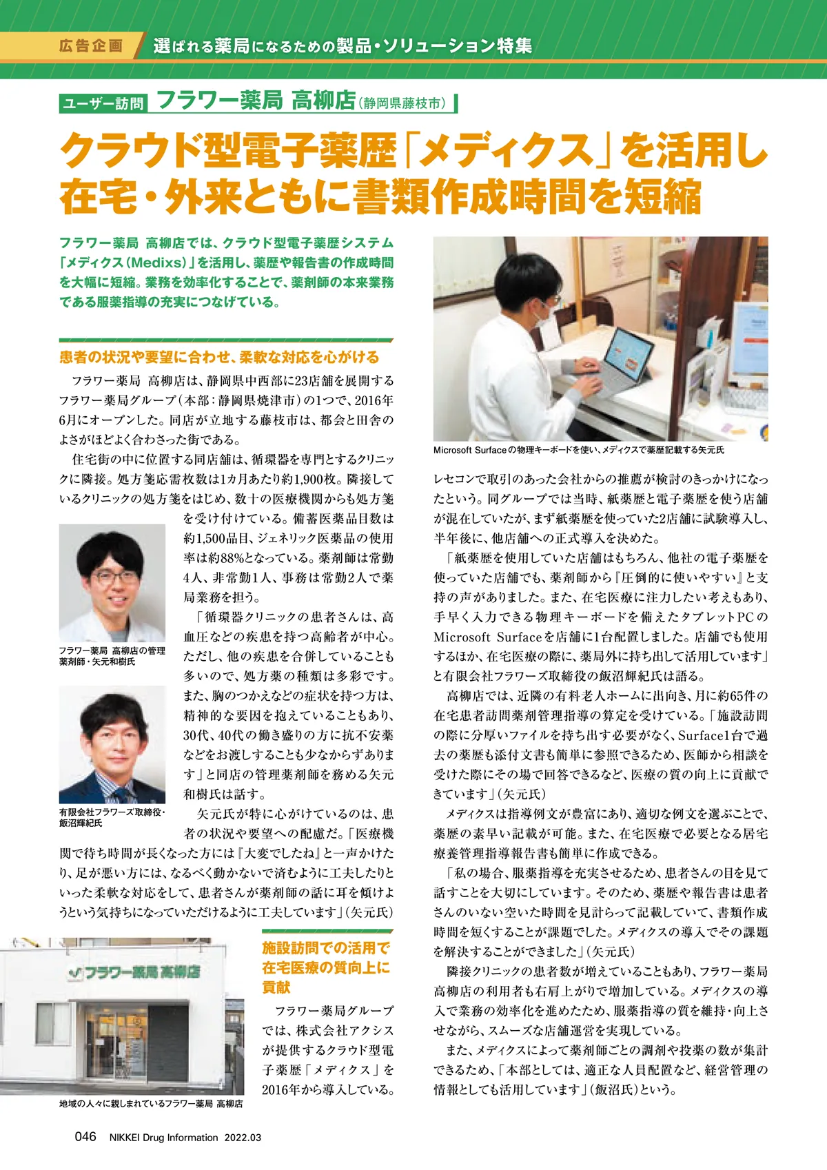 クラウド型電子薬歴「メディクス」を活用し、在宅・外来ともに書類作成時間を短縮