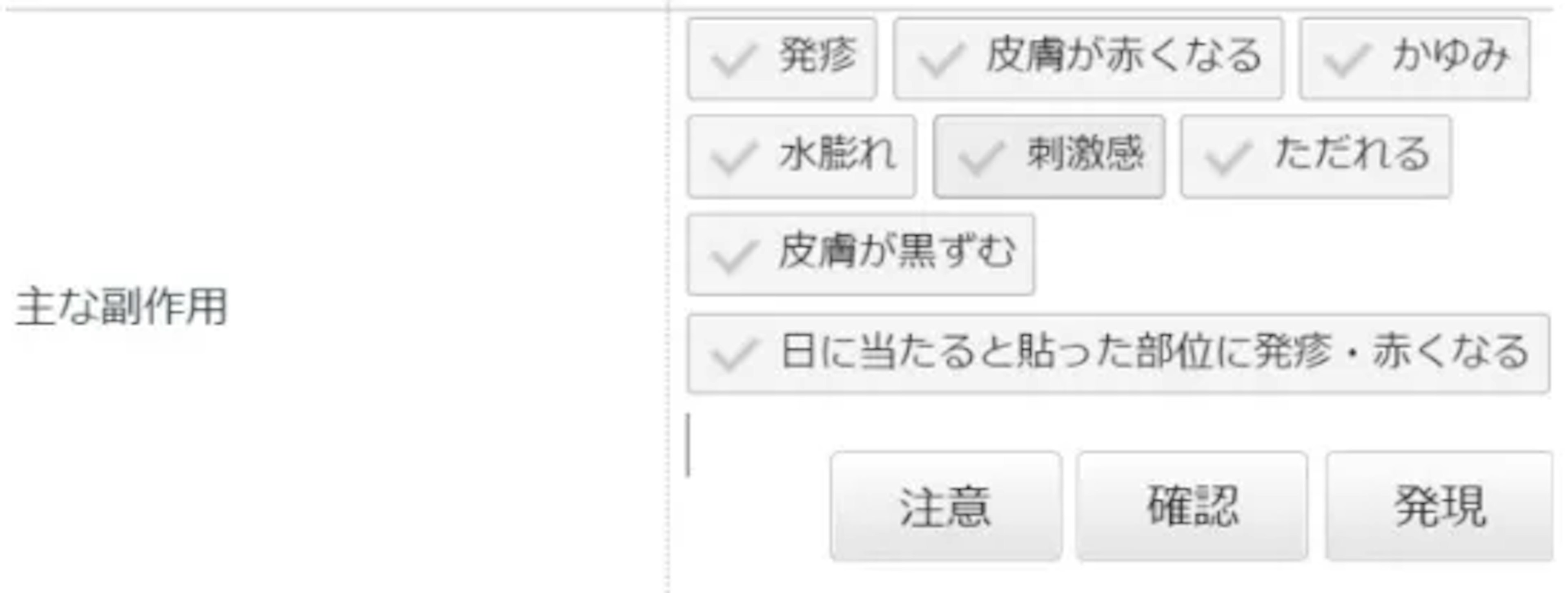 ↑副作用は、症状毎に「注意」「確認」「発現」で薬剤師が選択可能