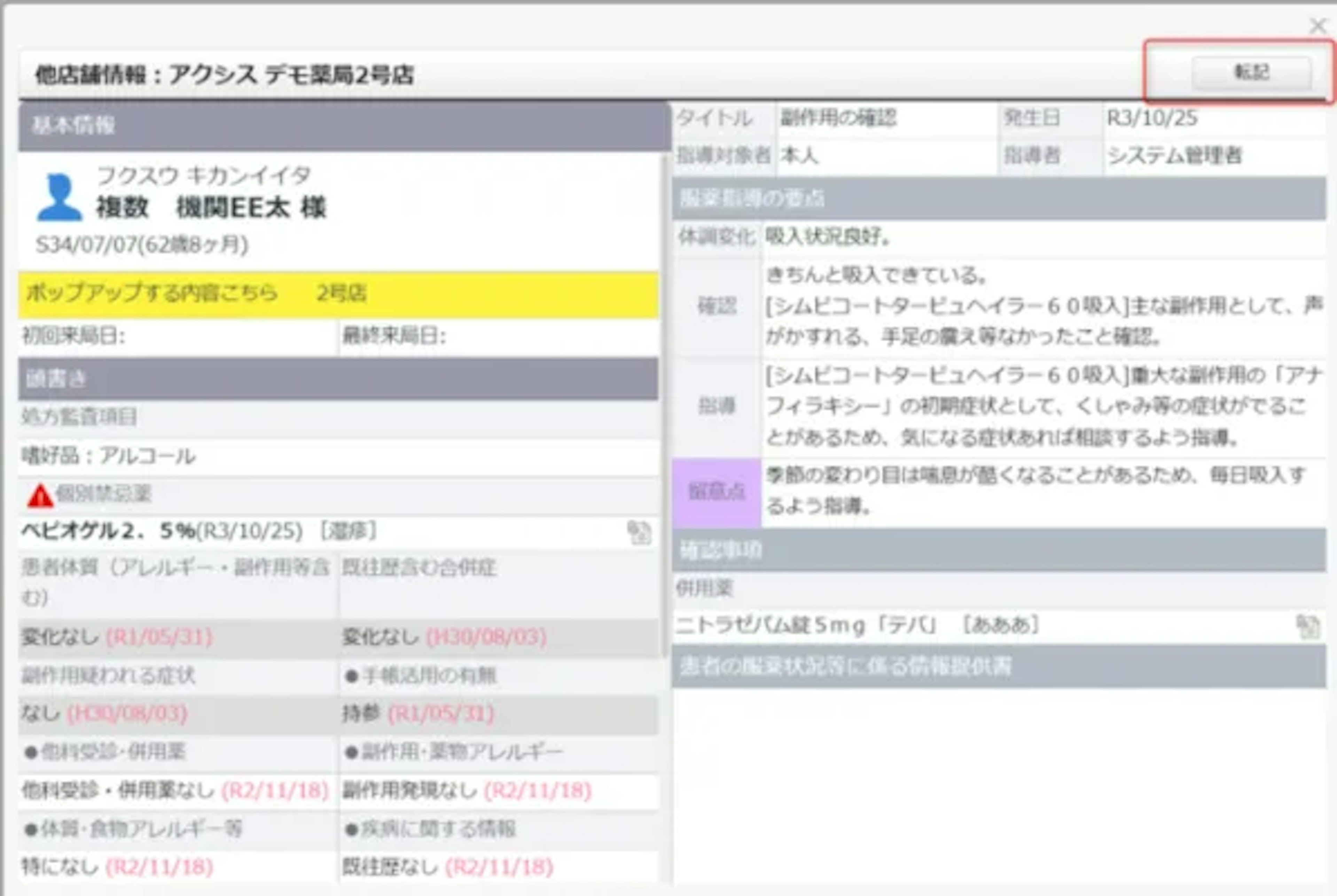 また患者さんが、系列店に来局されることもあります。その際に、他の店舗で入力した併用薬などのデータが閲覧、転記できるというのはとても良いですね。