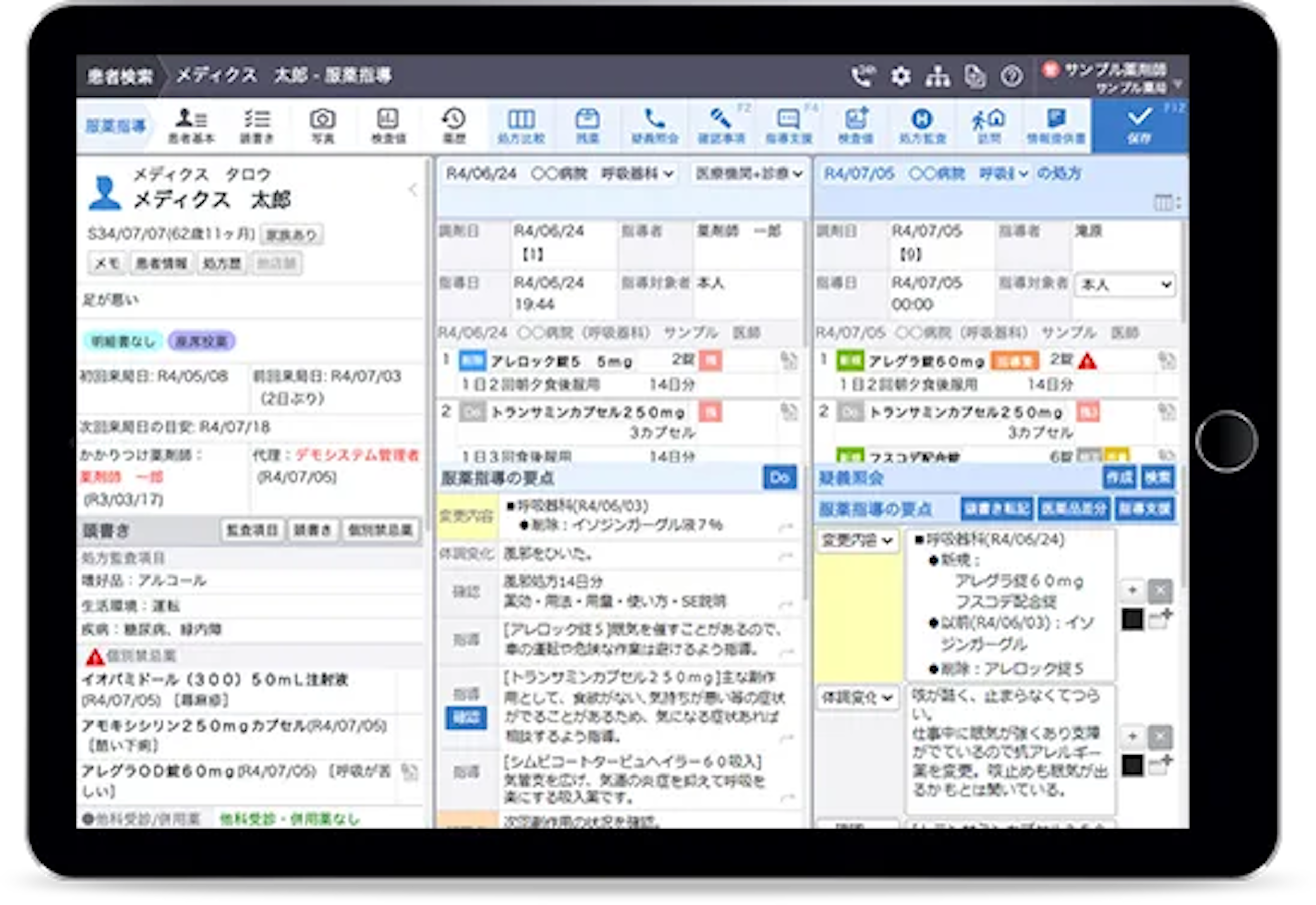 在宅に力を入れている店舗では、iPadを使用できるというのも大きなメリットとなっています。これまでのクラウド型電子薬歴は専用端末でしか使えなかったため、荷物が重くなってしまったり、すぐに充電が切れてしまったりということがありました。医師の訪問診療に同行する際など、患者さんの必要な情報がiPadの一画面でまとまって見られるので非常に便利です。