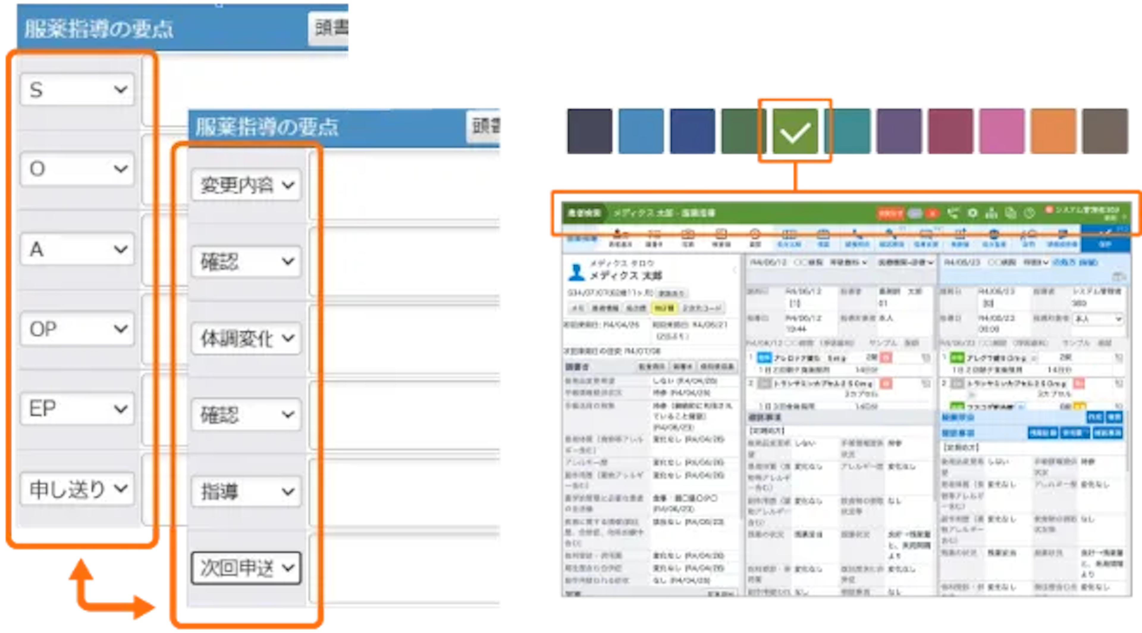 例えば在宅特化型の店舗では、報告書と薬歴のどちらか一方を記入すればよい場合に、必要なものを自動で割り振ってくれるよう設定しています。これにより、書かないといけないものを自分で探す手間がなくなるので、効率的に仕事を進めることができるようになりました。カスタマイズできすぎてどう使っていいかわからないということもなく、やりたいことをやりたいようにカスタマイズできるちょうどよいバランス感覚がメディクスの良いところですね。