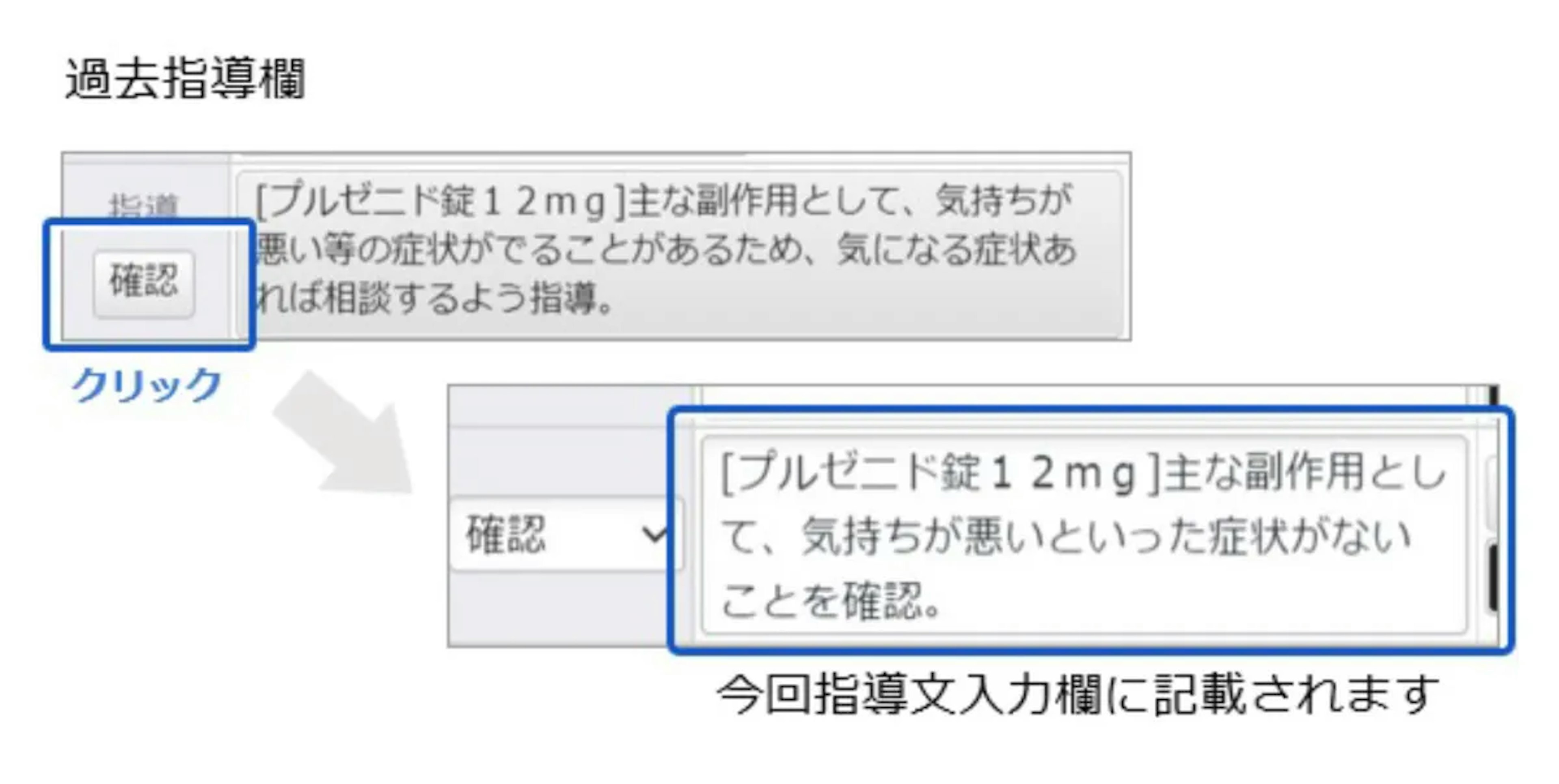 特に、ハイリスクの副作用の確認の際に、自動で文章が作成できる機能が特に気に入っています。前回指導した副作用について、確認ボタン一つで、前回の指導を踏まえた文章が作成されます。