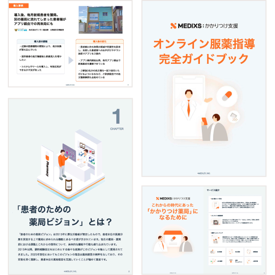 MEDIXSかかりつけ支援をはじめに理解いただく方へ、オンライン服薬指導に関する法制度から、かかりつけ薬局に関する資料などをわかりやすくご紹介した資料を無料で贈呈中です。ぜひお気軽にダウンロードください。